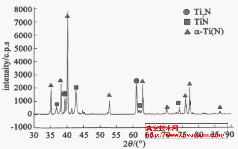 圖3 鈦滲氮4h 后斷面形貌SEM ×500 圖4 鈦等離子滲氮2h 后的X線衍射圖