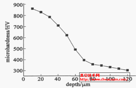 以顯微硬度儀測量滲氮層硬度,然后從滲氮層表面向鈦基體測量硬度,載荷為200g ,加載15s ,測出距表面不同距離的顯微硬度分布值。