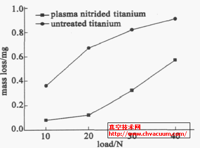 鈦試件等離子氮化后,在10N ,20N ,30N 和40N 載荷下,磨損量均顯著低于純鈦,見圖7。純鈦鑄件等離子滲氮后,表面形成滲氮復(fù)合層,硬度提高,且滲氮層與鈦基體的結(jié)合強(qiáng)度較高,因而抗磨損性能顯著提高。