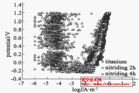 通過陽極極化試驗(yàn)研究滲氮鈦試件在人工唾液中的電化學(xué)行為,來分析其在口腔環(huán)境下的耐腐蝕性。從陽極極化曲線圖8 可以看出,鈦表面等離子滲氮后,腐蝕電位提高,陽極電流Icorr 降低,極化電阻增大,同氮化前相比,耐腐蝕性明顯提高,主要原因是鈦表面生成的均勻致密的氮化層含有大量氮化鈦相,而氮化鈦具有良好的耐腐蝕性。隨著滲氮時間的延長,鈦表面的氮化層逐漸增厚,因而耐腐蝕性逐漸提高。
