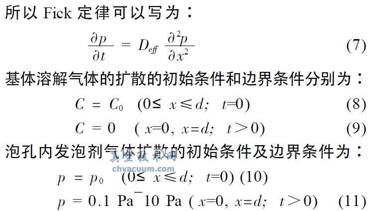無論泡沫基體內氣體的擴散還是還是閉孔結構內發泡劑氣體透過泡孔壁向外擴散,都遵循Fick 第二定律。