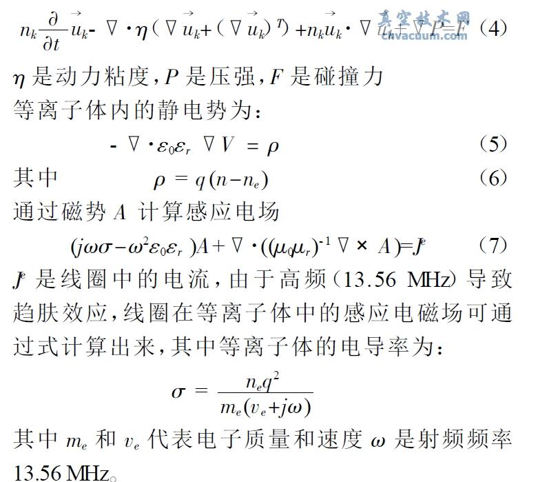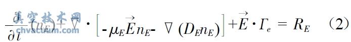 該方程第二項是電子能量通量的散度,其中μE=5/3×μe,Den=μE×Te,第三項是焦耳加熱,源項RE 包括感應加熱和電子和中性粒子之間的彈性和非彈性碰撞能量損失。