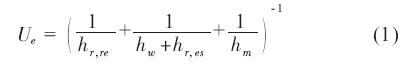 為了便于在給定環(huán)境溫度和真空管內(nèi)工質(zhì)溫度的條件下對(duì)集熱器的進(jìn)行傳熱計(jì)算,這里引入集熱器熱損系數(shù)Ue,它主要由真空管與環(huán)境(輻射和對(duì)流熱損失),真空管內(nèi)外管(主要是熱輻射)以及真空管內(nèi)管與熱管間工質(zhì)(以導(dǎo)熱為主)三部分組成。