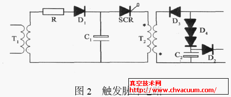觸發脈沖產生電路如圖2 所示,采用了高壓擊穿和能量續流的辦法。T2 是脈沖變壓器,產生一個負的高壓脈沖,脈沖前沿在35μs 左右。C1 是脈沖成形電容,C2 是脈沖續流電容,SCR 是可控硅。試驗時將D1D2 并聯構成全波整流,變壓器T1 接自耦調壓器,可以連續調節C1C2 的充電電壓,改變輸出脈沖峰值和續流能量。當C1 = 1000μF 且充電150V時,回路輸出空載脈沖電壓峰值在-20kV 左右。