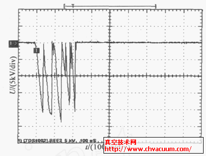 當UC2= 80V ,放電后電容上剩殘壓50V 左右,增大了觸發電流,實驗測得間隙被觸發時的回路電阻大約012Ω ,估算觸發電流為150A。從圖5 可以看到觸發極上連續5 次擊穿,最后才產生穩定的等離子體通道,使得觸發極接地。圖5 所示過程很不穩定,在兩次擊穿到十多次擊穿之間,相應的擊穿延時也就在50μs 到400μs 之間。這樣的實驗結果,很大程度上影響了TVS的使用。