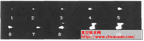 初始等離子體經歷了一個產生、發展到消亡的過程,實質上記錄了觸發針局部的發熱、融化和蒸發金屬蒸汽的過程。因其發展只局限于觸發極,并沒有引起主間隙的導通,真正的電弧也沒有產生,所以拍攝到的形狀僅是些小的亮點。拍攝的采樣頻率是30kHz ,即每張圖片之間間隔時間33μs ,由此可估算觸發極初始等離子體的發展持續了297μs 左右。圖4 中觀察觸發極5 次擊穿持續的時間,到最后一個尖峰共320μs ,之后的就是脈沖變壓器的空載震蕩波形了。這兩個時間基本相吻合。