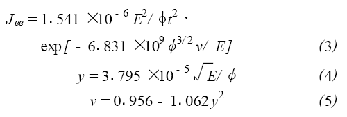 對于場擊穿觸發方式,放電起始于真空中的場電子發射,由弗雷-諾特海姆公式在電場E 下陰極發射的電子電流密度Jee為