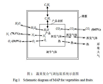 從圖中可以看到涉及的因素很多,如蔬果的呼吸作用和揮發(fā)氣體(CO2、H2O、C2H2)、充入的復(fù)合氣體(CO2、O2、N2)、蔬果呼吸產(chǎn)生的熱量、包裝薄膜材料的透氣性能以及環(huán)境大氣條件等等。這些因素還會相互影響,因此十分復(fù)雜。