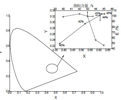 圖3色彩轉換膜厚度為20 um 時,顏料Orange Red 不同含量對CIE(X, Y)和色彩轉換效率的影響