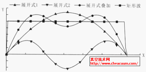 由傅立葉變換可知, 對于矩形波可以由一系列不同頻率的正弦波疊加而成。因為最理想的磁場形式是靶面的磁力線完全平行于靶面, 這樣靶面的磁場可以看成一段矩形波, 在內外兩磁路中插入反向磁場相當于取兩項展開。如圖5 所示。在圖4 中, 大磁鋼形成的磁場相當于圖5 中的展開式1, 小磁鋼之間, 及小磁鋼與大磁鋼之間形成的磁場相當于圖5 中的展開式2, 根據磁路疊加, 最后形成的水平磁場是接近于矩形波的雙峰形式。在改進的磁路設計中就是利用這一原理。從圖4 和圖5 中可以看出, 靶面的磁力線和磁場強度的水平分量更加平滑, 能夠有效地增加靶面跑道的寬度, 實現靶面均勻刻蝕。