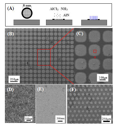 AlN 納米錐的圖案化生長是通過引入鉬網作為掩膜以AlCl3 和NH3 在700℃下反應實現的(如圖1A 所示)。將鉬網緊緊附著的硅片放置于管式爐的中心,當沉積區溫度升至700℃時,三氯化鋁在氬氣氣流的帶動下到反應區域,并與氨氣反應,AlN 納米錐在鉬網的間隔沉積,而被鉬網覆蓋的地方則沒有AlN 的沉積。反應持續4 個小時,在氬氣氣流的保護下冷卻至室溫,反應結束后,將鉬網除去得到圖案化的AlN 納米錐。本文中嘗試了兩種不同尺寸的鉬網作為掩膜。同時在相同條件下制備了未圖案化的AlN 納米錐作為比較。