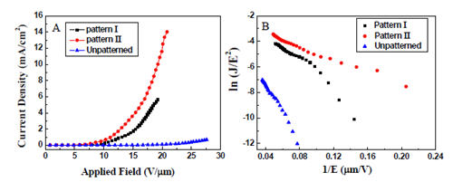 圖3.(A)圖案化樣品I、II 及未圖案化AlN 納米錐陣列的電流密度~電場曲線(J-E 曲線);(B)與J-E 曲線相對應的Fowler-Nordheim 曲線,即ln(J/E2)-1/E 曲線。