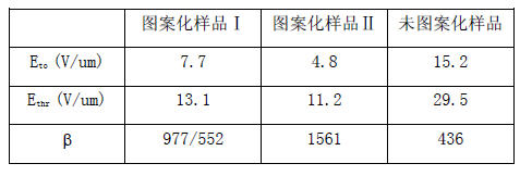 由于屏蔽效應的降低,兩個圖案化樣品的場增強因子有了明顯的提高(表一)。對于圖案化樣品I,其F-N 曲線分為兩段,在高場和低場的場增強因子分別為950 和600,這可能是由于空間荷電效應引起的。從圖3A 可看出,在高場部分,圖案化樣品I 的電流至少是未圖案化樣品的5 倍。高的電流密度會通過電離殘余的氣體分子產生空間電荷,在電場作用下,正離子移動到AlN 發射頭的尖端,使得發射頭的電壓增加,因此在高電場時具有較大的場增強因子。而圖案化樣品II 在低電場時就具有大的電流密度,荷電效應在整個電場下都存在,因此其F-N 曲線呈線性,場增強因子為1561。