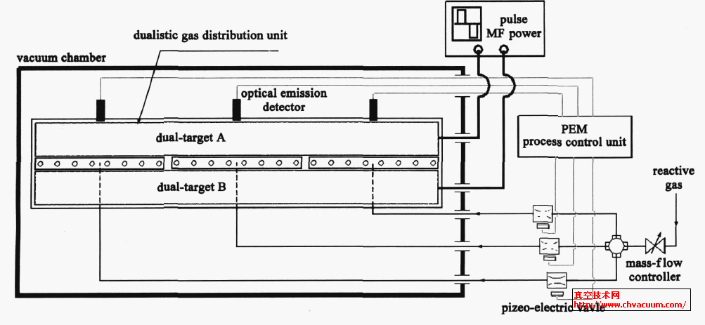 真空系統(tǒng)采用分子泵作為主泵,雙泵對(duì)稱(chēng)布局。矩形平面孿生靶由我們自行設(shè)計(jì)研制,兩靶面呈V形夾角布置, 靶面有效寬度100mm ( 單幅) , 長(zhǎng)度1800mm ,在兩靶的中央布局著三個(gè)單元的二分布?xì)鈾C(jī)構(gòu)(這種送氣機(jī)構(gòu)有響應(yīng)速度快、各出氣口出氣流量均勻、穩(wěn)定等優(yōu)點(diǎn), 是專(zhuān)為PEM 系統(tǒng)配置的) 。PEM系統(tǒng)購(gòu)自于德國(guó)的FEP 研究所(Fraunhofer Institute für Elektronenstrahl und Plasmatechnik , Dresden ,Germany) 。圖2 所示為本實(shí)驗(yàn)中的PEM控制系統(tǒng)等組成示意圖。