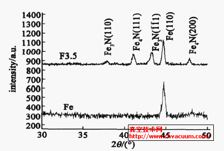 圖1 為等離子浸沒離子注入及氮化后樣品的X射線衍射圖譜,采用Cu 靶,掠射角5°。從圖中可以看出,在3.5kV 脈沖電壓下進行注入及氮化,在工業純鐵表面形成氮化物,氮化物結構主要為ε- Fe3N和γ- Fe4N。