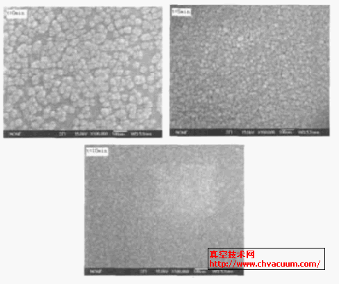 圖2 為對襯底進行H 等離子體預處理不同時間后,在其上分別沉積了5 min 的微晶硅薄膜的SEM 形貌。由圖2 可以看出,襯底未預處理時,薄膜的硅團簇顆粒較大,隨襯底預處理時間的增加,硅團簇顆粒尺寸逐漸減小,密度增大,當對襯底預處理時間為10 min 時,團簇顆粒較小,薄膜表面較為平整。產生上述現象的原因可能是適當H 等離子體預處理使襯底表面的原子氫增多,提高了成膜先驅物在襯底表面的遷移,有利于薄膜的初期成核,使薄膜易于晶化。