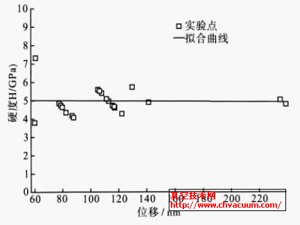 采用O&P 方法對(duì)壓痕數(shù)據(jù)進(jìn)行分析得到摻磷納米硅薄膜的平均彈性模量為5.00 GPa,其硬度與壓深關(guān)系如圖4。由于硬度值沒有明確的物理意義, 它的物理意義隨試驗(yàn)方法的不同而不同。壓入硬度表征了材料抵抗局部變形特別是塑性變形能力的大小。與體材料相比,摻磷納米硅薄膜的彈性模量比體硅的彈性膜量低,這說明薄膜的抵抗局部形變的能力比體硅要低。
