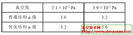 可以得到ln(I)和ln(U)的線性關(guān)系,n為直線的斜率。通過最小二乘法,求出數(shù)據(jù)的一次擬合曲線,可以得出n的值。表1中列出了對于不同的氣壓下對應(yīng)的兩種磁場結(jié)構(gòu)的濺射源n值。從表1的結(jié)果可以看出,優(yōu)化的磁場結(jié)構(gòu)對于電子的約束能力有所提高。
