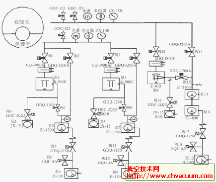 連續(xù)卷繞CPP膜鍍鋁設(shè)備真空工作腔體大、鍍膜氣載荷量高,要求真空系統(tǒng)抽氣速率快。真空系統(tǒng)由兩套相對獨立的真空抽氣機組組成,分別對上、下室體抽空,成為具有不同真空度的兩個部分,用復(fù)合真空計分別進行壓力測量。上室用油擴散噴射泵作為主抽氣泵,在10-1 Pa 時有很大的抽氣量,及時抽走隨著卷材打開而放出的附著水汽等介質(zhì)。下室用兩套KC系列新型高真空油擴散泵作為主抽氣泵,真空極限高、工作壓力范圍寬、抽速大、啟動快,保證在鍍膜時的高真空度和有效抽速。龐大的粗抽機組極大縮短了低真空抽氣時間,快速啟動高真空抽氣,節(jié)約抽真空時間,提高產(chǎn)能。三臺2X-15旋片泵分別作為三臺主泵的維持泵,節(jié)約能源。抽空系統(tǒng)流程如圖2 所示。