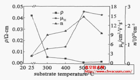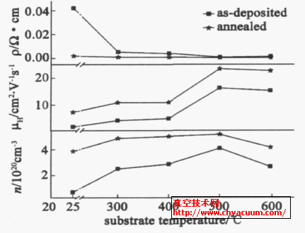 圖2 未退火薄膜的電阻率、載流子濃度、霍爾遷移率與襯底溫度的關(guān)系 圖3 400 ℃氫氣退火對(duì)不同襯底溫度沉積薄膜電學(xué)性能的影響