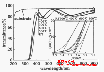 得出, d 為薄膜厚度, T 為透射率。作(αhν) 2~ hν關(guān)系曲線,其線性部分的延長線與橫軸的交點(diǎn)即為薄膜的禁帶寬度Eg 值。所做曲線如圖4 的插圖所示。結(jié)果表明,隨著襯底溫度的升高,薄膜禁帶寬度由3.39eV 逐漸增大到3.61eV , 但當(dāng)襯底溫度超過500 ℃后,禁帶寬度又會(huì)變窄。這種變化趨勢(shì)和薄膜的結(jié)晶性能及電學(xué)性能有關(guān),結(jié)晶質(zhì)量越好,電學(xué)性能越佳,禁帶越寬。