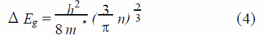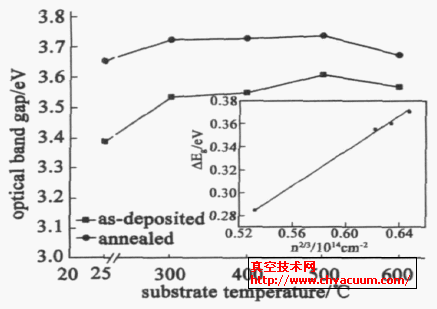 圖5 所示為400 ℃氫氣退火對(duì)不同襯底溫度沉積薄膜的禁帶寬度的影響。退火后薄膜禁帶展寬。禁帶展寬現(xiàn)象是由Burstain-Moss 效應(yīng)引起的,根據(jù)該理論,隨著薄膜中載流子濃度的增加,半導(dǎo)體變成n 型簡(jiǎn)并態(tài),費(fèi)密能級(jí)上升到導(dǎo)帶中,價(jià)帶中的電子需要更高的能量激發(fā)才能躍遷至導(dǎo)帶中的高能級(jí),相當(dāng)于薄膜的有效光學(xué)帶隙被展寬了△Eg 。對(duì)于n 型半導(dǎo)體,B - M 效應(yīng)引起的帶隙展寬與載流子濃度之間的關(guān)系為: