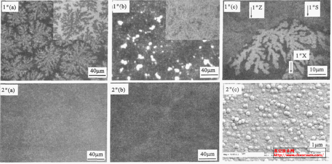 圖2 1 # 和2 # 多晶硅薄膜表面的光學顯微鏡和SEM照片