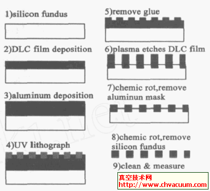 樣品制備工藝(如圖2 所示) :用丙酮和去離子水超聲波清洗干凈硅片后,用紅外燈烘干,利用LPP2CVD 方法制備類金剛石薄膜,然后利用磁控濺射在類金剛石膜上鍍鋁膜作為掩護層,再在上面甩一層光刻膠,經光刻、化學腐蝕,把微圖形轉移到Al掩膜上,再用反應離子刻蝕,形成所需的類金剛石薄膜微結構,最后腐蝕硅片,得到“獨立”的微器件,并進行組裝。