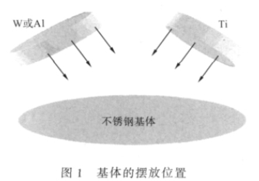 采用PSII 型雙放電控微波ECR 等離子體全方位注入裝置制備薄膜。濺射靶材選用純度均為99.99%的W 靶、Ti 靶及Al 靶,基材選用40Cr 不銹鋼,其尺寸為(10 mm×10 mm×3 mm)。在對試樣進行100 W,10 min 反濺射清洗后送入主濺射室中,靶與樣品均采用水冷,初始真空度≥5×10- 4 Pa,工作氣體為純度≥99.99%的氬氣,反應(yīng)氣體為氮氣(純度99.99%),雙靶功率均為200 W,時間2 h,工作氣壓1.0 Pa,基體的擺放位置如圖1所示。濺射沉積后試樣經(jīng)800℃×1 h 熱處理測定其成分并表征物相組織。