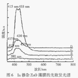圖6 是真空技術網給出的In 摻雜ZnO 薄膜的光致發光(PL)譜。作者認為摻InZnO 薄膜的PL 譜中的藍紫發射雙峰來源于In 摻雜所引入的In 替位雜質和鋅空位(VZn)缺陷。