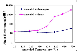 2. 氮氣氛圍中,GZO薄膜的方塊電阻隨著溫度的增加,先減小后增加,在400℃退火后可得最小方塊電阻11.031Ω/;隨著溫度的增加,空氣中退火后的GZO薄膜的方塊電阻急劇增大;400℃氮氣退火后的GZO薄膜有最小應力;