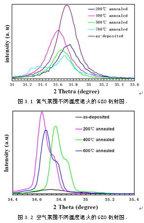 ZnO,且是磁控濺射法制備的,所以已具有了一定的內部應力。在空氣退火后,其2角分別變成了34.64°、34.76°、34.66°在200℃、400℃和600℃退火后。在氮氣退火后,其2角分別變成了34.76°、34.62°、34.64°在200℃、400℃和500℃退火后。由公式斯托克2dsinθ=nλ所以可以看出在氮氣400℃退火后,其應力最小。