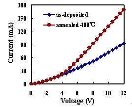 圖4.3不同退火的GZO電極的LED在100mA電流下的I-W曲線