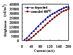 3. 在400℃氮氣氛圍退火15mins后,LED芯片的電壓電流曲線得到了極大地改善,相同的驅動電壓下可得到更大的電流;但其亮度曲線和光輸出強度曲線均變差:亮度值在相同的驅動電流下都降低了約6000cd/m2; 在驅動電流為100mA時,退火后的LED其光輸出強度降低為原來的70%,所以磁控濺射法制備的GZO電極LED芯片性能在400℃氮氣氛圍退火15mins不能得到改善。