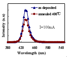 圖4.3給出了在驅動電流為100mA時,光的在不同波段的強度曲線。從圖上可知,退火前后其發光波長沒有明顯變化,幾乎都為438nm。在波長為438nm,退火后的LED其光輸出強度降低為原來的70%。由此可知:氮氣氛圍400℃退火15分鐘后,GZO透明電極的LED芯片光輸出強度降低,光效降低,性能變差。