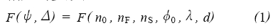 其中n0 為入射介質折射率、d 和nF 為薄膜厚度及折射率、ns 為基片折射率、φ0 和λ為橢偏光束的入射角和波長。