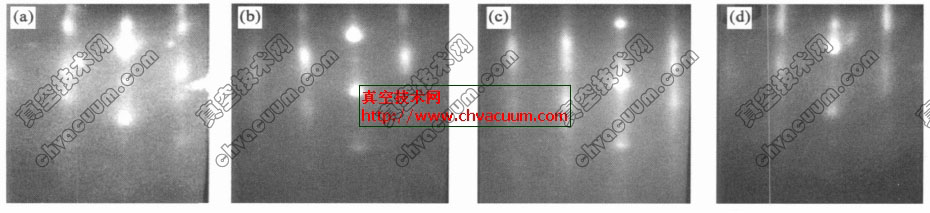 圖1 給出未沉積Ge 的樣品A 和不同襯底溫度下沉積Ge的樣品(b) 、(c) 、(d) 的RHEED圖. 在圖1(a) 中,可以看到在SiC 的亮條紋內(nèi)側有微弱的斑點,這是由于襯底Si 原子通過孔洞向SiC薄膜外擴散并在表面形成一定的Si 原子排列或者Si 的團簇導致。從(b) 、(c) 、(d) 圖中,并沒有看到Si 的點,這說明在不同襯底溫度下沉積的Ge 都抑制了Si的擴散和孔洞的形成。比較四個樣品的SiC 的衍射條紋,可以看出(b) 、(c) 、(d) 圖的SiC 的條紋要明顯好于圖1(a)的條紋,這說明預沉積Ge 后,改善了薄膜的質量。觀察不同溫度下預沉積Ge的樣品,并沒有發(fā)現(xiàn)RHEED圖有明顯的不同。
