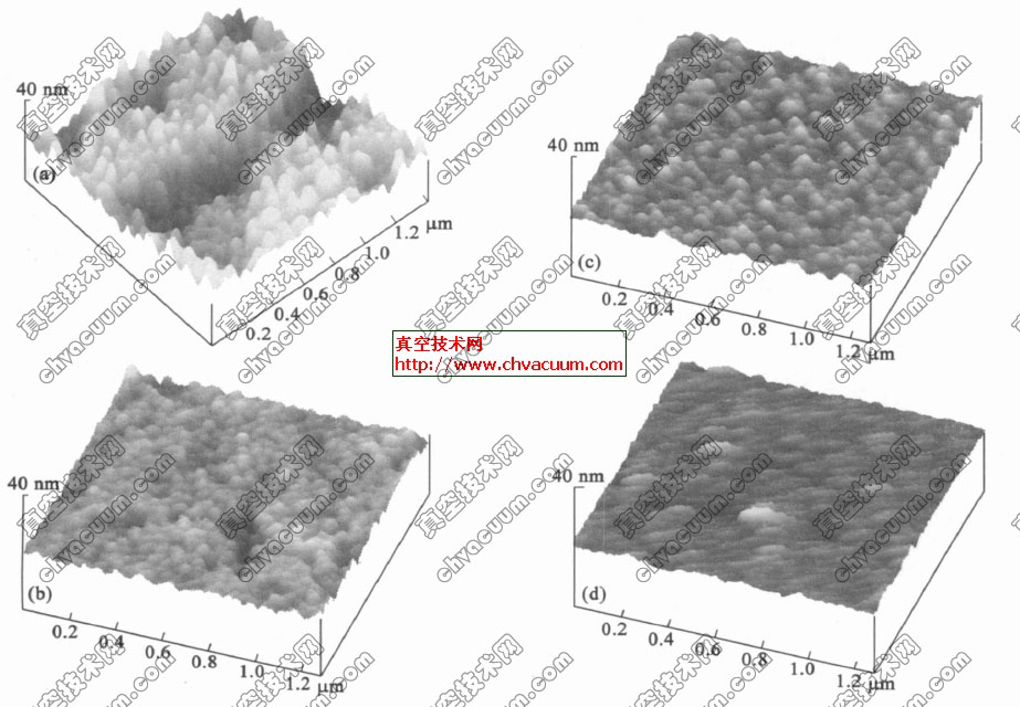 為研究不同襯底溫度預沉積Ge 對薄膜形貌的影響,對樣品進行了AFM的測試。圖2 給出了未沉積Ge的樣品(a) 和不同溫度(300、500、700 ℃) 預沉積Ge 的樣品( (b) 、(c) 、(d)) 下的三維AFM圖。表1給出了樣品的粗糙度數(shù)值。從圖2(a) 中可以看到未沉積Ge的樣品表面有明顯的三角形的孔洞,這主要是由于襯底Si原子的外擴散所致。與圖2(a)圖進行比較,從圖2 ((b)、(c)、(d)) 中可以看到在不同溫度下沉積Ge后的樣品的表面都沒有明顯的孔洞存在,這說明Ge 的預沉積抑制了襯底Si 的擴散,減少了孔洞的形成。比較圖2(a)、(b)、(c)、(d)圖,可以看到(b)、(c)、(d)圖的表面要明顯好于(a)圖,從表1中也可以看到未預沉積Ge 的樣品的粗糙度為10.121nm ,遠遠大于不同溫度下沉積Ge 的樣品的粗糙度,這說明在不同溫度下沉積Ge后的樣品薄膜質量都比未沉積的樣品要好。這與前面的RHEED 結果是一致的。比較圖2 (b) 、(c) 、(d)圖,可以發(fā)現(xiàn)隨著預沉積溫度的升高,薄膜的表面逐漸變得平整,粗糙度變小。此外,還發(fā)現(xiàn)隨著預沉積溫度的升高,顆粒的尺寸在變大。這些結果都說明了沉積Ge的薄膜質量要好于未沉積Ge 的,而且隨著預沉積溫度的升高,薄膜的質量在變好。