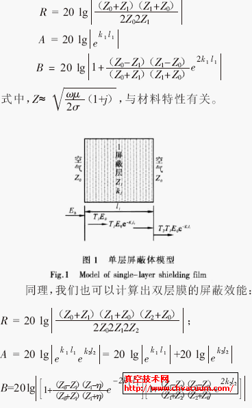 對于單層抗EMI 膜的屏蔽效能(圖1),中間為金屬屏蔽層,其波阻抗和傳播常數分別為Z1和k1,厚度l1,兩邊均為空氣,波阻抗為Z0,為計算方便,假設金屬屏蔽層是無限大平板。根據傳輸線理論,最終可以獲得單層屏蔽層的屏蔽效能,反射損耗R、吸收損耗A、多次反射損耗B的表達式為:
