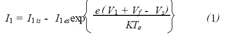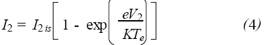 I2is是探針2的飽和離子電流, V2 是探針2 相對(duì)于Vf 的電位。由于雙探針電路相對(duì)于等離子體處于“懸浮”狀態(tài),流入一個(gè)探針的電流與流出另一個(gè)探針的電流相等,所以I ≡I1 = - I2 。