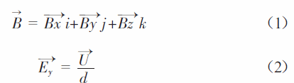 平面磁控濺射系統(tǒng)結(jié)構(gòu)如圖1所示,圖中靶基距為30mm,陰極加-300V偏壓,陽(yáng)極接地,選取鋁為靶材,直徑為100mm,濺射氣體選擇氬氣。為模擬靶材上方X 與Y 方向的磁場(chǎng)分布以及Y 方向的電場(chǎng)分布,利用有限元分析軟件ANSYS 針對(duì)上述模型進(jìn)行求解。磁場(chǎng)與電場(chǎng)分別由公式(1)和(2)表示