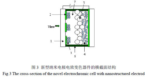 此項(xiàng)技術(shù)是由NTERA 首先提出的,即使用改良的多孔納米薄膜構(gòu)造的電極來(lái)達(dá)到變色的目的,結(jié)合有機(jī)變色材料變色時(shí)間快、著色效率高、色彩鮮艷的特點(diǎn),利用多孔納米材料高的比表面積來(lái)大量的吸附有機(jī)變色分子,這種有機(jī)分子稱為甲基紫精(Viologen),當(dāng)納米半導(dǎo)體電極接受了電子之后就形成強(qiáng)的呈色原子團(tuán)。如圖3,1 為透明玻璃基片,2 為導(dǎo)電薄膜,3 為納米TiO2 薄膜電極,4 為電容存儲(chǔ)層ATO,5 為大顆粒TiO2,6 為封裝材料Surlyn,7 為電解質(zhì)。