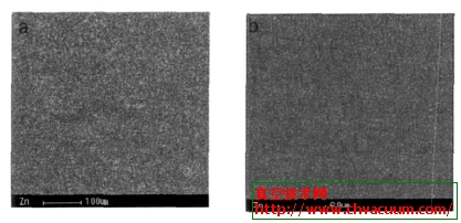 從電子探針EPMA 所得到的直觀圖形可知,圖2(a)和(b)中白色點為基體試樣浸Zn 前后表面含Zn 的分布,對比可知浸Zn 后的鋁合金表面,Zn層分布均勻, 幾乎覆蓋了整個鋁合金表面; 圖3為浸Zn 后的表面形貌圖, Zn 層致密分布,由于是化學鍍,Zn 的晶粒尺寸比較大, 表面凸凹不平, 但是可以為后面的化學鍍鎳形成機械咬合作用, 經過退火后更容易互滲。這一點也可以從截面形貌看出,Zn 層很薄(0.5um)并且Zn 層和鎳層擴散互滲,截面已經很難分辨。