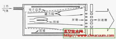 放電室中產生的離子向所有的邊界擴散,并且在等離子體與柵極附件形成弓形離子鞘,經柵極離子光學系統加速引出放電室形成離子束。