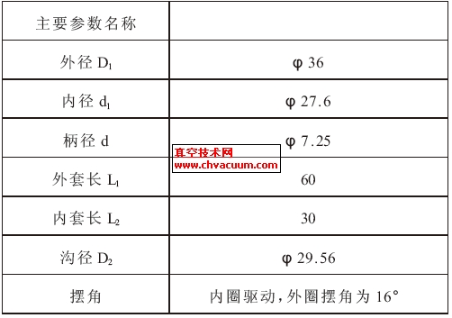 擺桿軸承作為一種往復傳動裝置,可以把旋轉運動轉化為直線運動,其部件簡圖如圖1 所示。內圈通過傳動齒輪和主軸同步旋轉運動,外圈通過汽缸和鉆頭主軸連桿,通過擺桿軸承這種結構,把主軸的連續旋轉運動轉換為鉆頭的往復直線運動,實現電錘的打擊、鉆削動作。具體運動表現:內圈驅動,外圈擺動,鋼球在保持架的限制作用下在溝道里轉動,整個部件的主要設計參數如表1。
