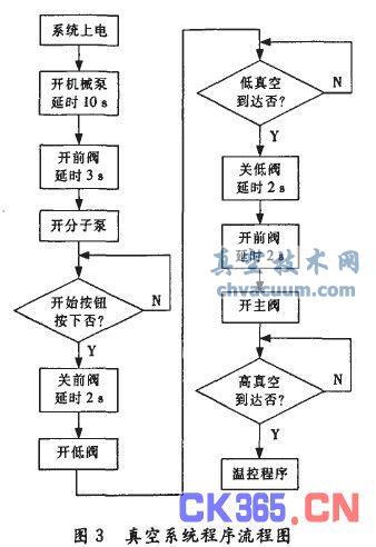 真空系統負責對機械泵、分子泵和各閥門進行順序控制,以保證真空室內的真空度。根據工藝要求和各閥門之間的連鎖關系,確定程序流程見圖3。