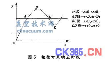 積分環節的本質是對過去一個時間段內的偏差e的積累,具有落后性。因此在何時引入積分環節需要對被控變量的響應過程進行分析。圖5所示的響應曲線中,在oA段和BC段,尤其是靠近A和C時不能引入積分環節,否則會引起過大的超調;在AB段和CD段需要引入積分環節以使被控變量盡快返回到目標值。結合各段偏差P和偏差變化率ec的正負號可知:e·ec>O時可引入積分環節,e·ec