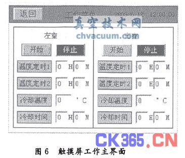 采用西門子winCC flexible 2005軟件來組態TPl70B觸摸屏界面,共開發了12幅畫面。包括畫面選擇、工作主界面、溫度設定、真空設定、報警信息和溫度曲線等。圖6為其工作主界面。
