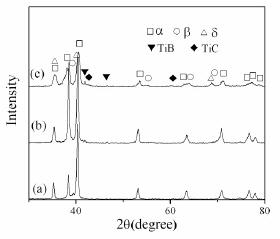 置氫復(fù)合材料的X 射線衍射分析結(jié)果如圖1 所示。原始復(fù)合材料(0 wt.% H)XRD 圖譜中除了α 和β 相的衍射峰,只有TiB 和TiC 增強(qiáng)體相的衍射峰,沒有其他相。說明本試驗中成功的以原位反應(yīng)(1)和(2)為基礎(chǔ),制備出顆粒增強(qiáng)鈦基復(fù)合材料(TiB+TiC)/Ti-6Al-4V。