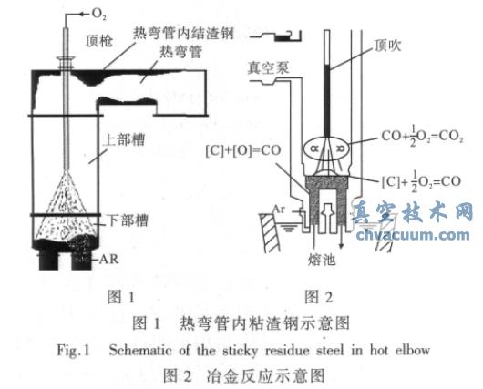 RH 真空爐是生產超低碳鋼的關鍵設備,對改善產品結構、提升產品檔次起著至關重要的作用。宏發煉鋼廠轉爐二車間兩座180t RH 真空爐是由西門子奧鋼聯SIEMENS- VAI 公司總體設計,在熱調試三個月后就進行超低碳鋼的大批量生產,在生產的過程中,無論是設備參數還是實踐操作都暴露出了問題,尤其是在冶煉超低碳鋼真空脫碳過程噴濺導致的一些問題嚴重制約生產。比如,噴濺的渣鋼將攝像孔粘死,操作人員看不到真空槽內冶金反應,頂槍孔粘渣鋼使頂槍升降受阻,難以進行吹氧作業,槍頭積渣導致氧槍點火困難,熱彎管內積聚渣鋼多影響抽氣功能和脫碳效果,導致熱彎管更換頻繁。真空爐粘渣鋼部位見圖1 所示。根據上述情況,詳細地分析了脫碳過程噴濺的機理,結合生產實踐,提出了相應的控制措施,解決了真空爐脫碳過程中噴濺的技術難題。
